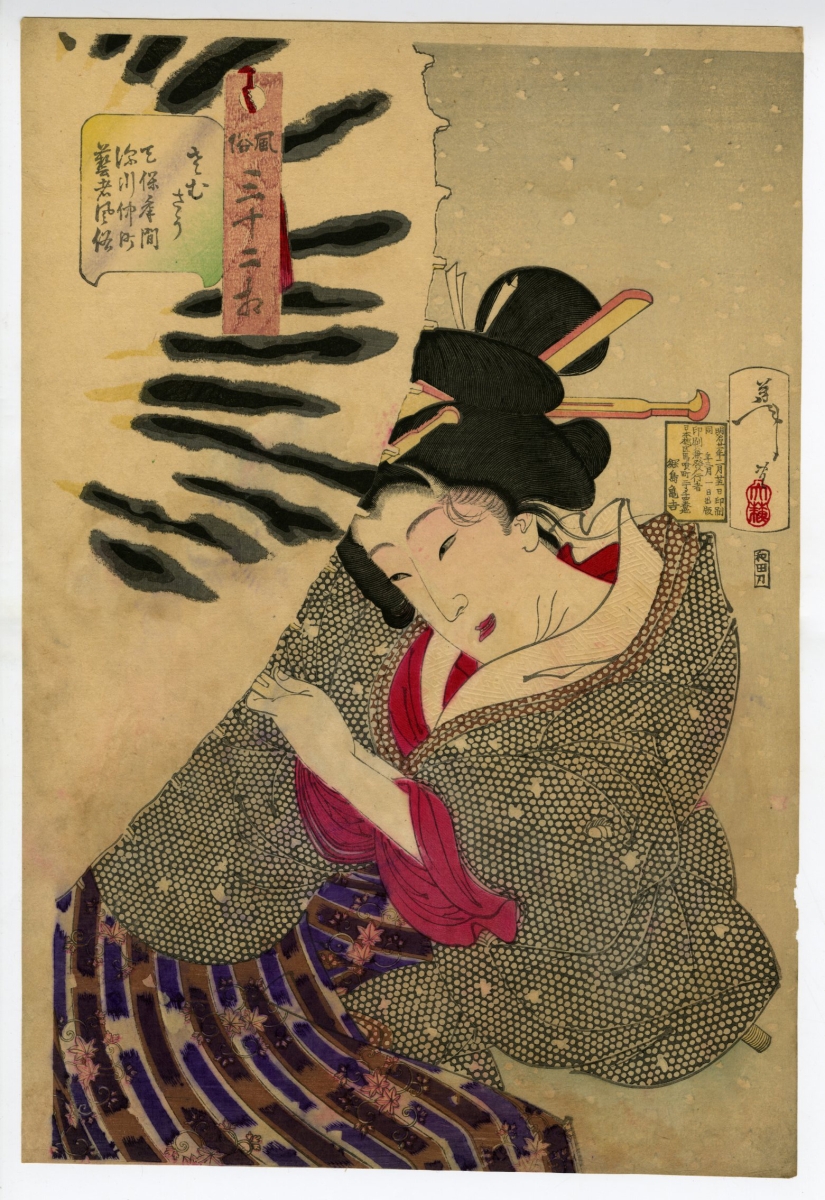 Ukiyoe painter. Also referred to as Gyokuro, Kaisai, Oso, and others as Betsugo. A pupil of Kuniyoshi , a fellow of Kawanabe Kyosai under the master in common. In the end of Bakufu, he attempted to get out of the Kuniyoshi fs style in the warrior painting, actor painting, and beauty, instead produced many atrocity prints with cruel depictions reflecting the timesf trend, which brought him a nickname gBloddy Yoshitoshi h. In around 1878, he was largely affected by Kikuchi Yosaifs painting style, to which he added a western style in order to create his own, with which he produced many pieces taking the subject from historical incidents. In the following year, he began to produce the multi-color print newspaper, his creativity never dried out. He made a greatest success among the Ukiyoe painters of the times most of whom were fading away. He also instructed Toshikata as his mentor. His painting style has been handed down until today through Kaburaki Kiyokata and Ito Shinsui .
