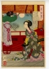 The artwork shown is one of Tsukihyakushi (=One Hundred Aspects of the Moon), a serial artwork of Tsukioka Yoshitoshi who was called the last ukiyo-e painter after the end of Bakufu. He took seven years to complete this great artwork consisted of 100 pieces."