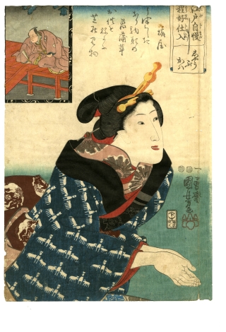 Utagawa Kuniyoshi (1797-1861) was an ukiyo-e painter, a pupil of Toyokuni I, also referred to as Ichiyusai, Choro etc. One of three popular ukiyo-e painters from Utagawa school in the end of Bakufu.